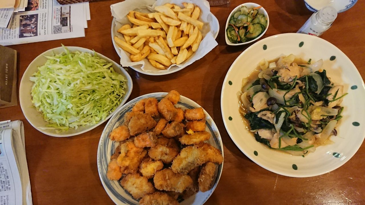今晩はいっぱい作りました。フライドポテト、鮭と鱈のフライ、鶏肉と野菜の炒め物、キュウリの酢の物、そしてキャベツの千切り。