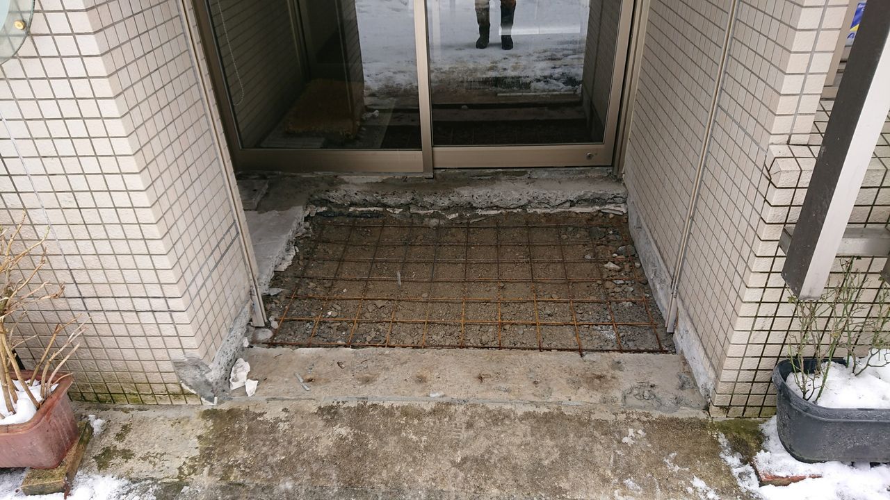 クリニックの玄関をバリアフリーにする工事中です。スロープにする予定です。